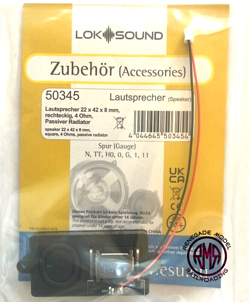 Elevate your model railway experience with the ESU LokSound 50345 Speaker. Measuring 22 x 42mm and boasting a 4 Ohm impedance, this speaker is finely crafted to deliver exceptional sound quality. Its integrated sound chamber and baffle design ensure optimal acoustics, producing clear and immersive audio that brings your layout to life. Whether it's the thunderous roar of a locomotive or the subtle whistle of a passing train, every sound is faithfully reproduced with remarkable clarity and depth. Upgrade your model trains with this high-performance speaker and enjoy a truly captivating auditory experience on your railway journey.